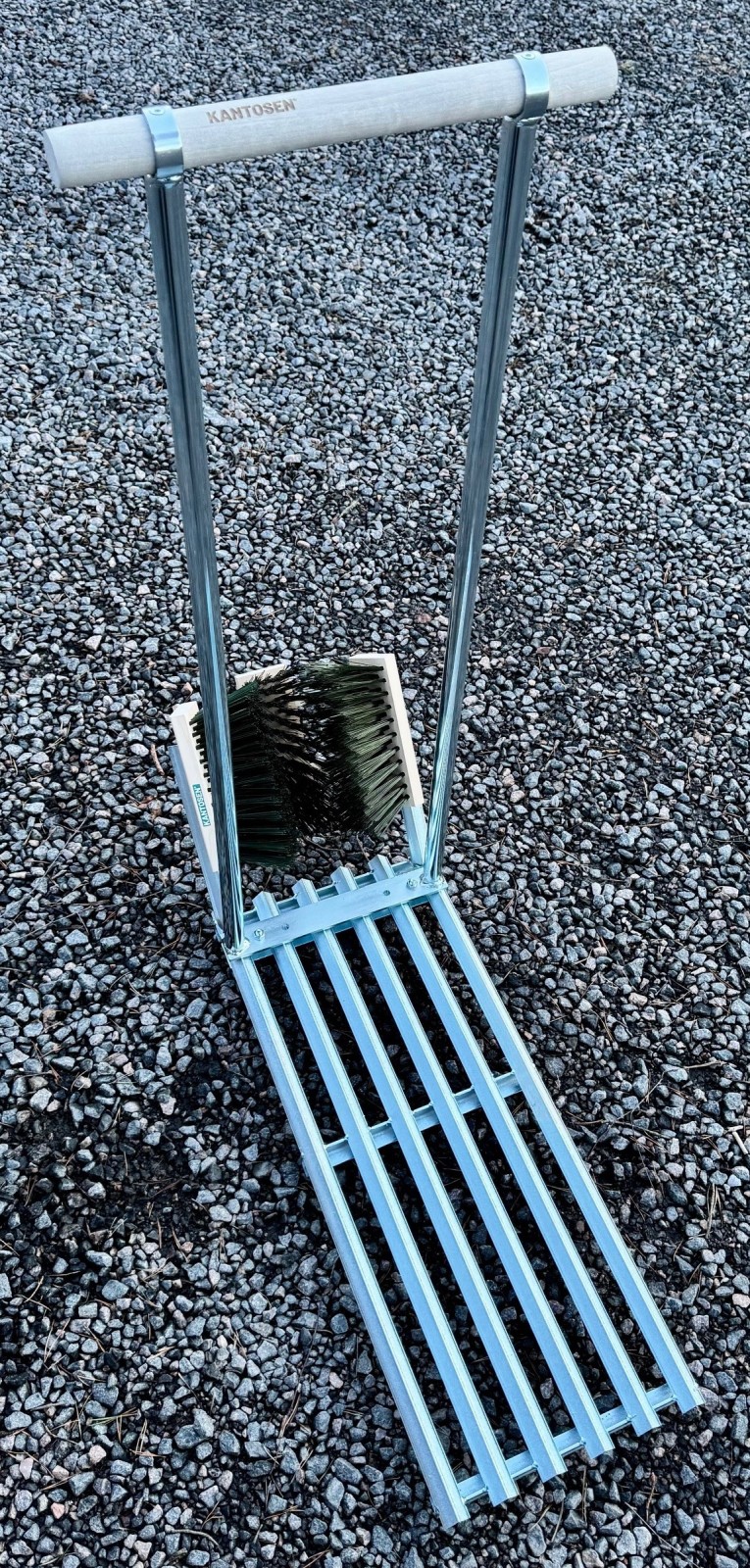 Harjatelineen voit kiinnittää joko porrasritilään tai seinään. Seinäkiinnitystä varten on itse hankittava seinämateriaaliin sopivat kiinnitysruuvit. Tästä käytetään myös nimeä rappuralli seinäkiinnityksellä eli tämä on rappurallin harjasosa, ilman ritilää. Harjatelineen avulla on helppo puhdistaa jalat ennen sisälle menoa. Avainlipputuote.